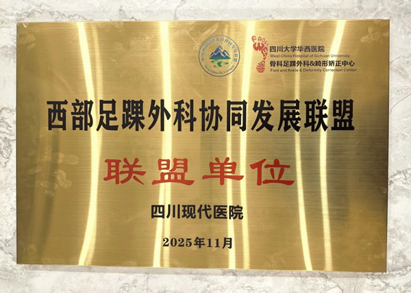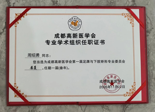 经西部足踝外科协同发展联盟严格评审与综合考量,四川现代医院凭借在足踝外科领域雄厚的专业实力、卓越的诊疗水平、先进的硬件设施以及积极的区域协作精神,成功获准加入“西部足踝外科协同发展联盟”,并正式成为联盟单位成员;同时,我院手足显微外科周绍勇主任当选为成都高新医学会第一届足踝与下肢矫形专业委员会委员。