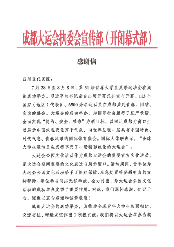 近日,四川现代医院收到了成都大运会执委会发来的感谢信,感谢我院对成都第31届大学生夏季运动会医疗保障、应急处置能力提供了强有力的支持,肯定了我院的专业技术能力和参与保障工作人员的良好精神风貌。