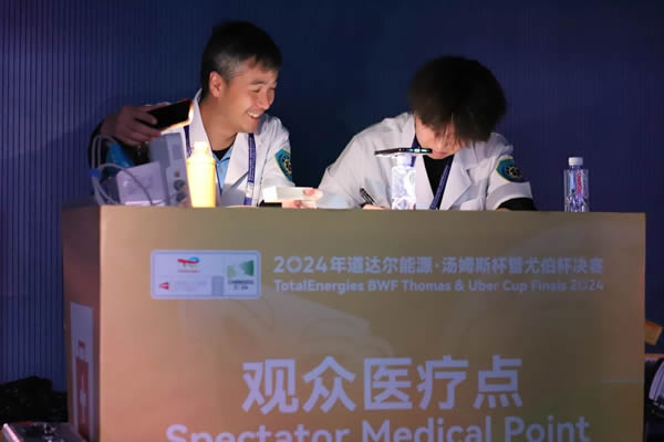在激情四溢的羽毛球赛场上,不仅有运动员们挥汗如雨的身影,更有我们医疗团队默默付出的身影。2024年,备受瞩目的“汤尤杯”羽毛球赛事在成都盛大举行。四川现代医院作为医疗保障单位,高度重视,精心组织了一支7人精锐医疗小组,该小组由急诊科、骨科、呼吸科等相关专业医护人员组成的保障团队,确保了医疗团队的专业性和全面性。且该团队成员都拥有着丰富的大型赛事保障经验,为这场国际级赛事提供了全方位的医疗保障服务。