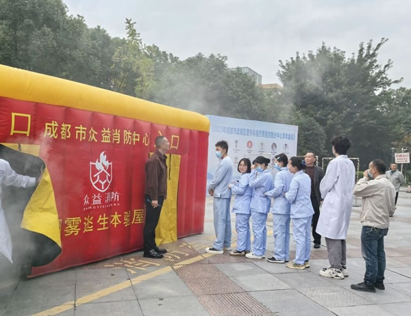 在实操演练环节,参训人员分组操作灭火器、消火栓、消防面罩等器材,模拟火灾发生后的应急疏散流程,并在不同火势情境中学习科学的避险方法。