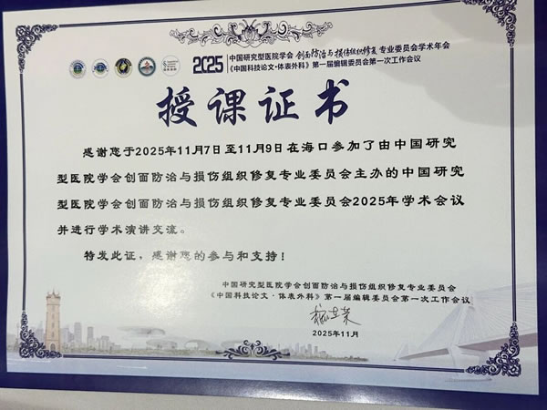 作为专题授课嘉宾,张航主任以《股前外Flow-through皮瓣串联不同穿支皮瓣修复肢体复合组织缺损》为题进行学术分享。演讲中,他结合临床典型案例,深入剖析了股前外Flow-through皮瓣技术的应用要点,引发与会专家学者的广泛关注与热烈讨论。凭借精彩的授课表现,张航主任被组委会授予“授课证书”,这既是对他的认可,也是对四川现代医院手外科的充分肯定。