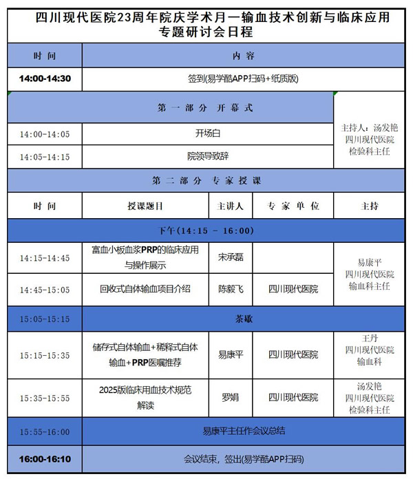 值此四川现代医院建院23周年之际,为全面展现学科建设成果,我院特举办“二十三载砺初心·学术领航向未来”院庆学术月活动。首期学术活动将以输血专业为主题,聚焦临床输血安全、技术应用及质量管理等核心议题。诚邀广大医疗机构管理人员检验科、输血科、康复科、美容科骨科、普外科、手外科等相关临床科室专业人员踊跃参与,共促学科发展!